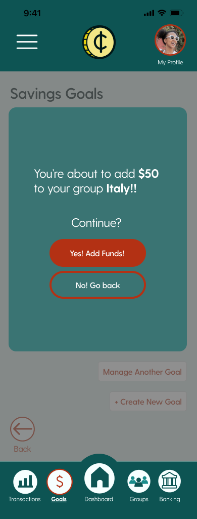 To avoid user error, there is now a confirmation for adding funds to any savings goal. This helps eliminate user error, as it makes sure the user doesn’t accidentally enter in the wrong amount of money to the wrong group.