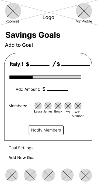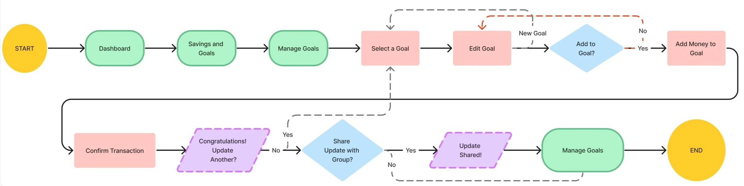 This user flow shows the user navigating from the dashboard to the goals page, adding to a goal, and confirming the addition. This was chosen because it involves the user navigating the software’s prompts, as well as finding the goal that is found by navigating the app.