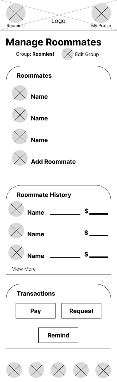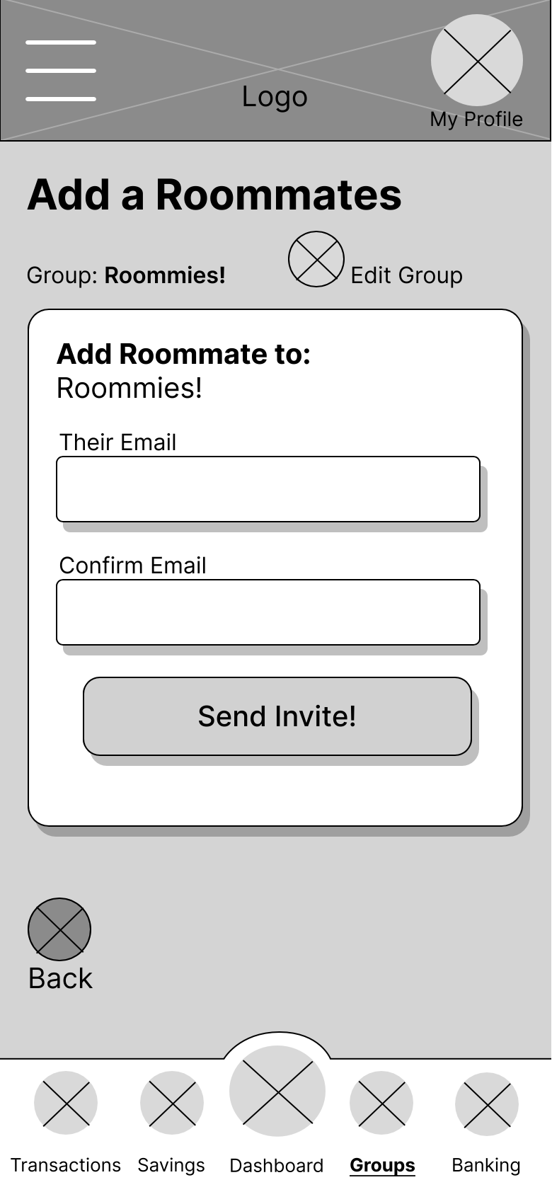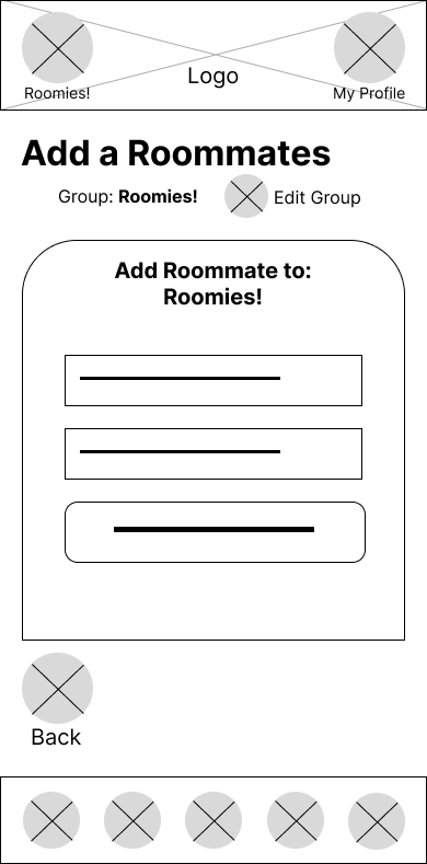 This user flow shows the user navigating from the opening screen to the roommate page, adding a roommate, and sending an invitation. This was chosen as a flow due to the different pages having to be navigated, as well as the different interactions (text boxes, buttons, tabs, etc.)