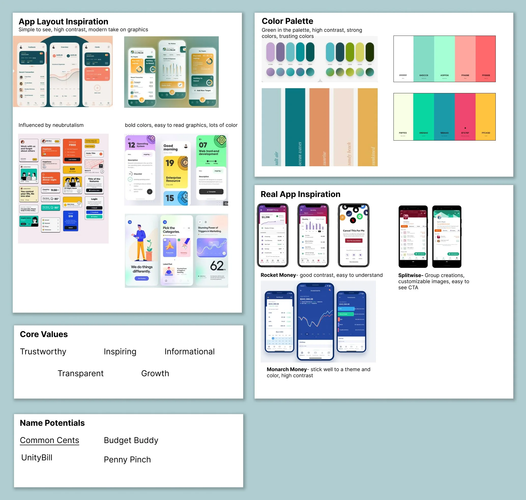 The goal of this mood board is to show real life and hypothetical ideas for the layout, colors, and style of the app Common Cents. Neubrutalism and more modern styles were big inspirations for this app, as the target audience is young adults.