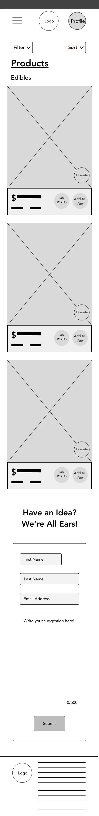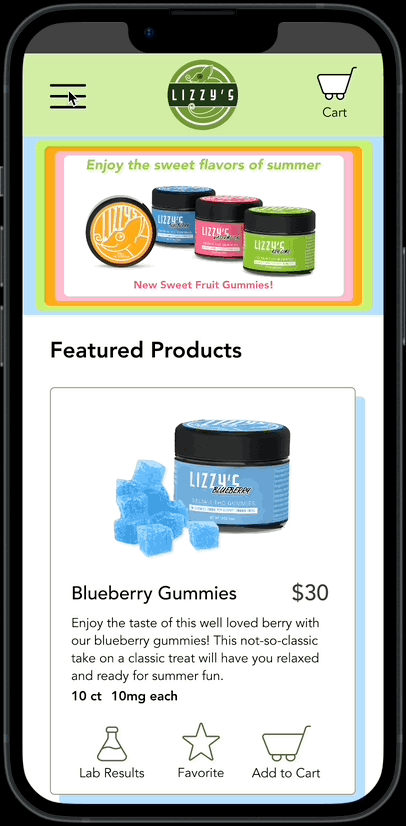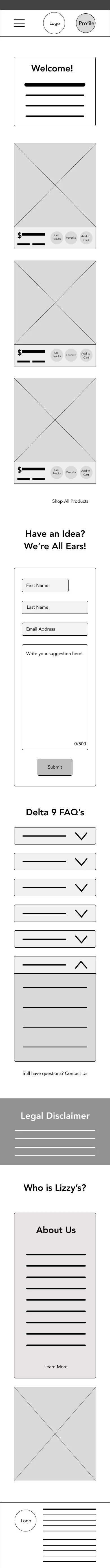 The suggestion box was added to build a connection between the user and the company. Lizzy’s wants to extend a branch to their users and help them feel like they’re part of the process by suggesting potential flavors and products. Click arrows to scroll through wireframe pages.