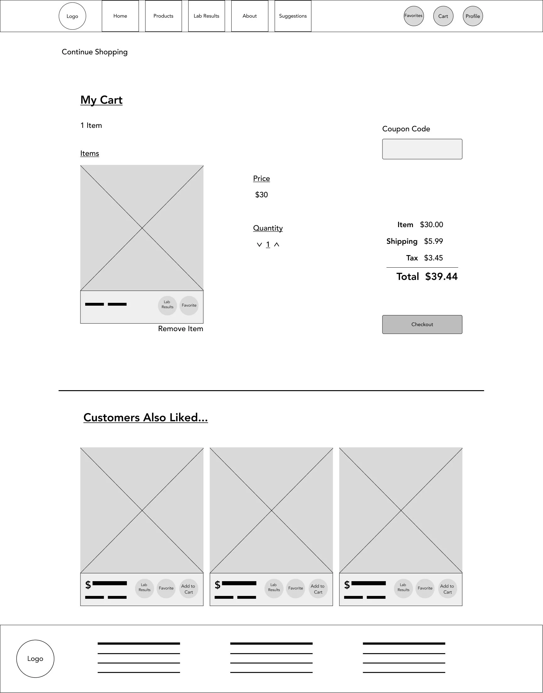 The mid fidelity wireframes were created in order to add more visuals to the website’s layouts. Adding a basic image for the product, accurate potential text, and working buttons and interactions allow potential future tests with users to plan out layout of the completed website. Only desktop layouts were created for the mid fidelity wireframes. Testing on the desktop allows the users to focus on one layout, and iterations can be made on both desktop and iPhone. Click arrows to scroll through wireframe pages.