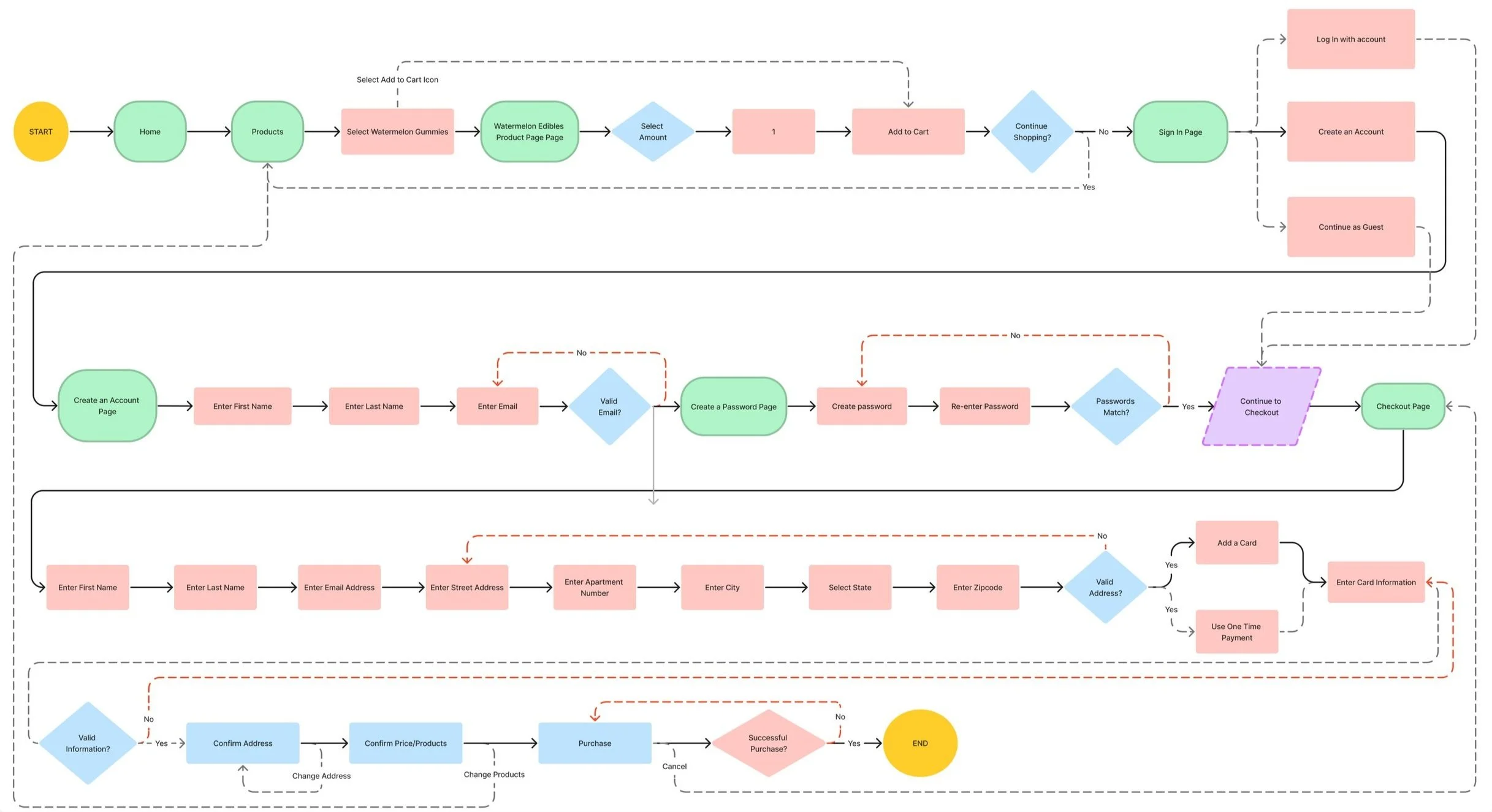 I decided to make this flow longer, because it goes about the typical e-commerce flow. The user, through this flow, is able to look at the landing page (or home screen), find the product through the home screen or products page, select the correct product and amount, and add to cart. Once in the cart, the user can then select how they want to proceed, either as guest or through logging in. They must then enter their information according to what was selected (for this flow, the only valid option is to log in to an existing account). After entering their billing and shipping information, they are ready to check out, thus ending the flow.